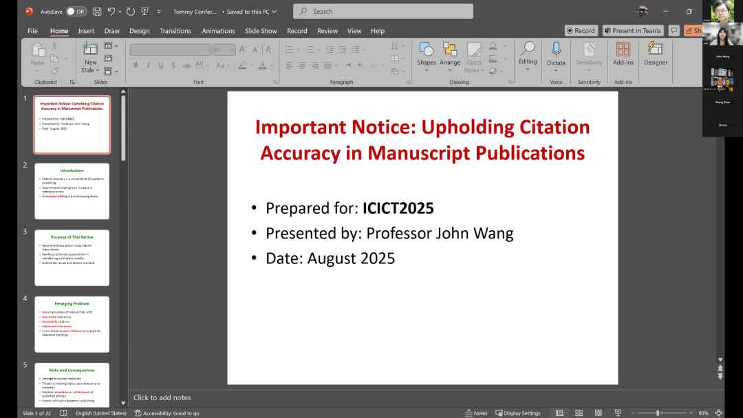 8月2日,“2025年第十四届信息与通信技术国际会议(ICICT-2025)”在线上顺利召开。由大会主席Mohammad S. Obaidat教授、荣誉主席ShiKuo Chang教授、项目主席John Wang教授依次致开幕词。